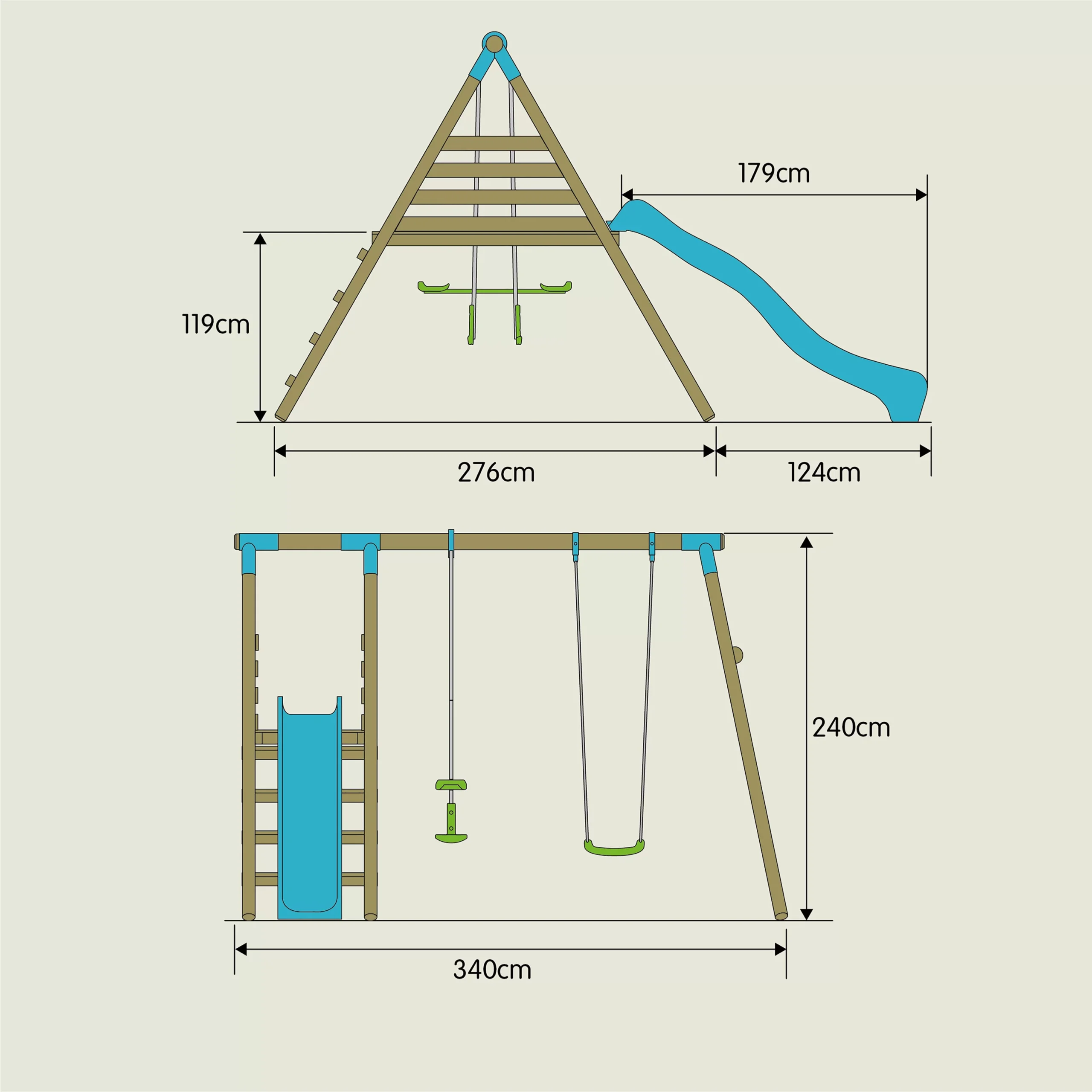 A rustic double round wood swing and slide set made from pressure treated FSC certified wood. The climbing deck is generous in size and accessed by the strong, safe ladder. The 2.5m slide provides a speedy and fun escape route! Sold complete with a two- seater fun Glide Ride and an apple green swing seat.